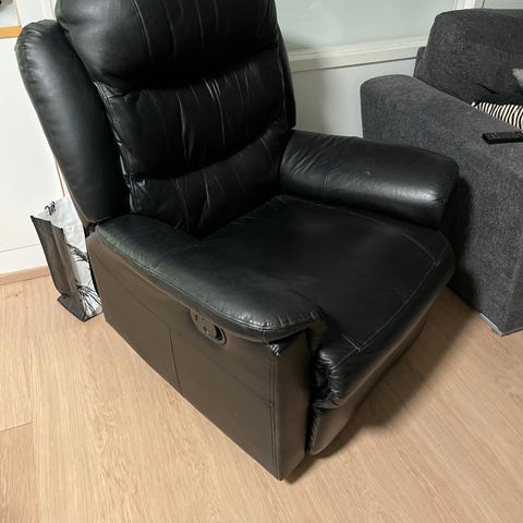 Nahkainen lepotuoli / Mekanismituoli. Pieni kuluma kohta, yleisilme kuitenkin siisti.