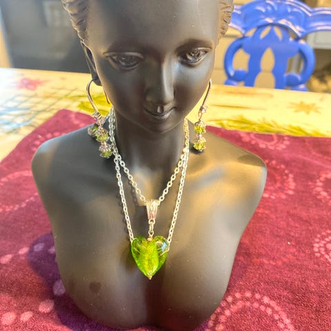 Setti sis. Kaulakorun sinisellä lasisydämmellä ja ketjun jonka saa 2 eri pituuteen. Korvakorun helmet myös sinistä lasia. Kaunis ja tyylikäs kokonaisuus.