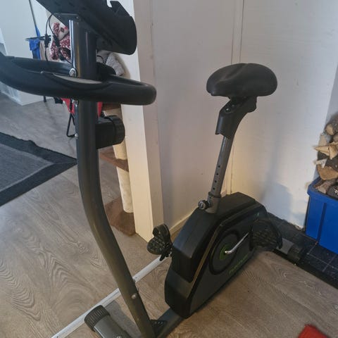 Karhu kuntopyörä, väri valkoinen. Sisältää säädettävän satulan. Polkemisen rasituksen voimakkuus säätö toimii normaalisti.