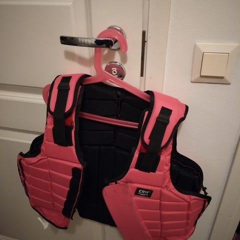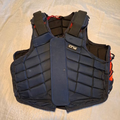SRT ratsastusliivi, koko 8/S, väriltään ruskea. Liivi on pehmustettu ja suunniteltu tarjoamaan suojaa ratsastuksen aikana.
