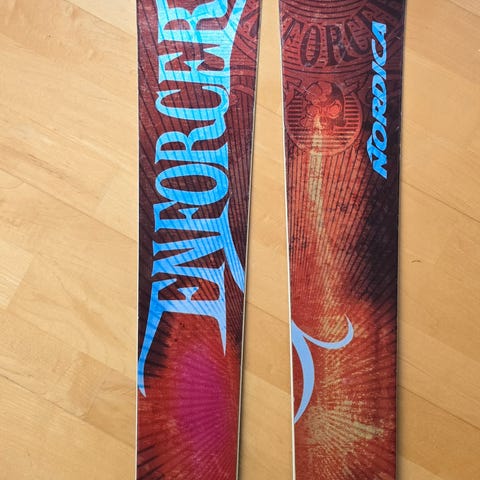 Nordica Enforcer 110 laskettelusukset, pituus 177 cm, leveys 140-110-129 mm, kääntösäde 18,5 m. Suksissa kiinni markerin kingpin 13 siteet asennettuna 287mm monolle. Mukaan myös g3 skinit.