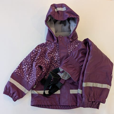 Koko 86-92cm. Hyvin pidetty, ehjä ja siisti sadeasu välikausiin ja leutoihin talvikeleihin. Asu on hintansa mukainen.