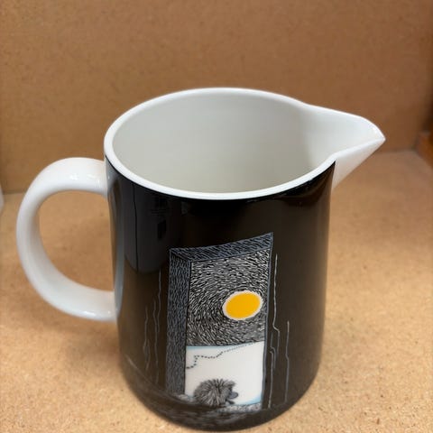 Arabia Muumi kaadin, Ystävyys, jossa sininen kuvitus. Keittiöväline, joka soveltuu nesteiden tarjoiluun.