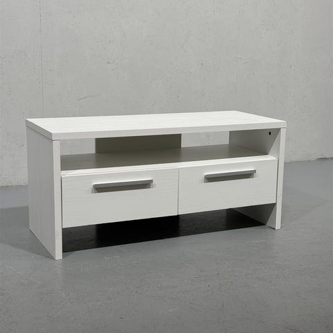 Valkoinen TV-taso, jossa avohyllyt. Sopii television ja muiden viihdelaitteiden sijoittamiseen. Väri valkoinen, materiaali puumainen tai vastaava.