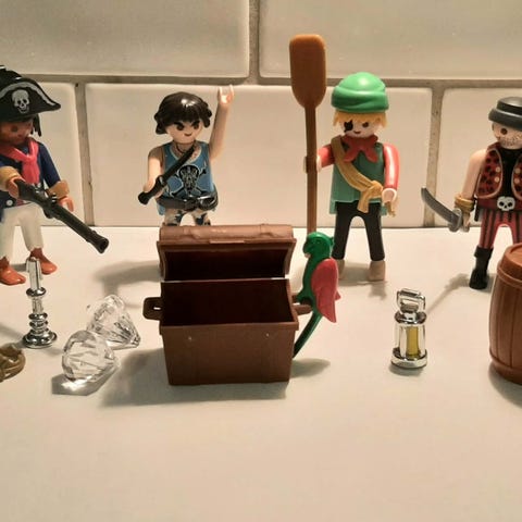 Hiiohoi! Kaikki hahmot kannelle! Niitä löytyy kolme erilaista. Lisäksi tykki toimii ja ammuksia on kuin myös purjeita ja lippuja.Laiva tietysti myös kelluu vedessä.Toisessa pyörässö käytön jälkiä.