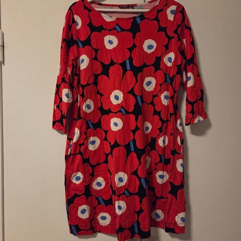 Marimekon musta-harmaa trikoomekko Akvarelli Unikko kuosilla. Puhelimen kamera vääristää hieman väriä. Marimekon tuotekuvassa näkyy väri ehkä hieman paremmin. Materiaalina mukavan joustava viskoosi-elastaani trikoo.