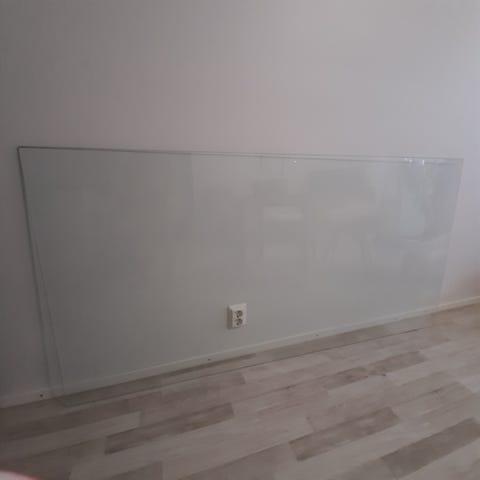 Lasilevy esimerkiksi pöydän päälle. Mitat leveys 100 cm, pituus 220 cm ja paksuus 0,5 cm. Karkaistua lasia ja reunat hiottu.