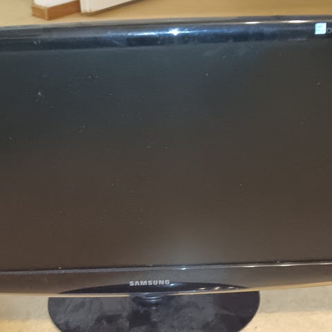 Samsung TV, jossa noin 19-20 tuumainen näyttö, musta väri ja useita liitäntämahdollisuuksia kuten HDMI ja komponenttivideoliitännät.