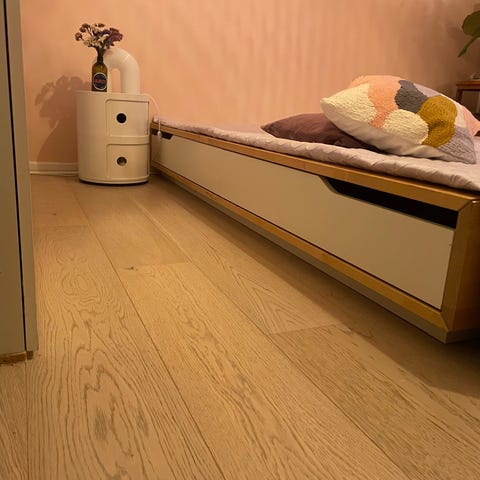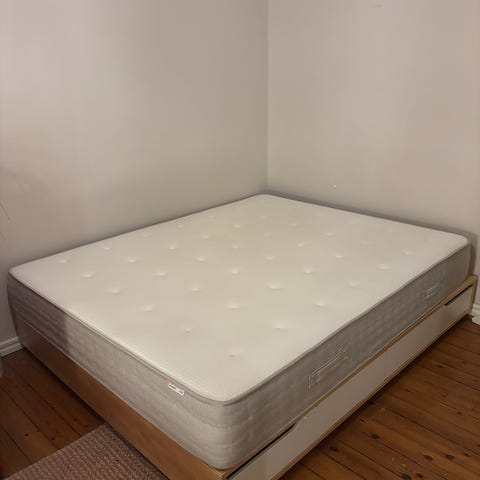 IKEA puinen sängynrunko, jossa on neljä laatikkoa säilytystilaa.