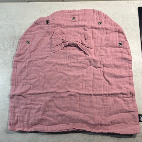 Ihana oliivinvärinen Unavaatteen vaunuverho korkkimerkillä.
