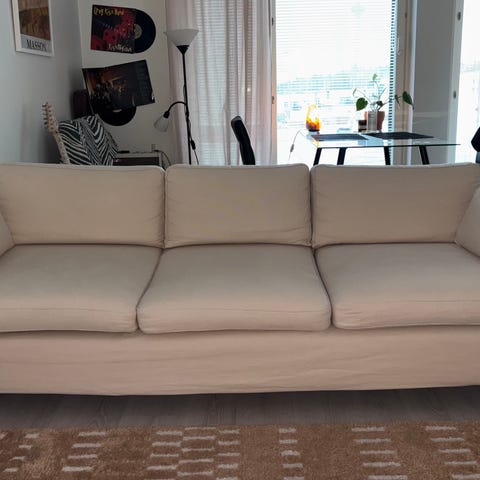 Siisti ja hyväkuntoinen. Vaalea karhea kangas, vahvaa ja laadukasta tekoa. Leveys 200cm, syvyys 86cm. Oma nouto, kantoapu löytyy.