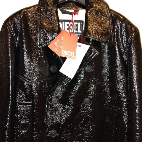 Diesel Takki miehille, koko L. Takki on valmistettu polyesteristä ja on violettia väriä. Siinä on punaiset ja tummansiniset raidat hihoissa sekä Diesel-logo takana. Takissa on napitettava etuosan sulkeminen ja sivutaskut.