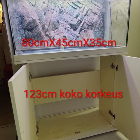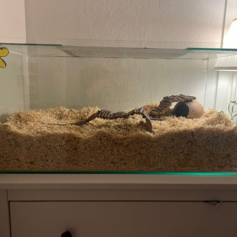 Lasinen terraario puukehyksellä sisältää verkolla peitetyn kannen. Mukana on puinen oksa ja muutama pienempi tarvikkeena oleva esine. Lisäksi mukana on sininen muovinen kantokoppa, jossa on läpinäkyvä kansi.