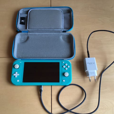 Hyväkuntoinen Nintendo Switch pelikonsoli, telakkayksikkö HDMI-out, lautauskaapeli, Joy-Con ohjaimet, 16 GB kortti. Mahdolliset kielet näkyvät kuvassa.