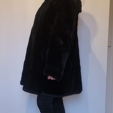 Chris-Designin erittäin vähän käytetty, kauniin tummanruskea minkkiturkki, koko n. 38 (koko merkintä puuttuu turkista). Pituus olalta 120 cm, leveys kainaloiden kohdalta takin kiinniollessa noin 47 cm, kaksi taskua. Nouto Koskelasta.
