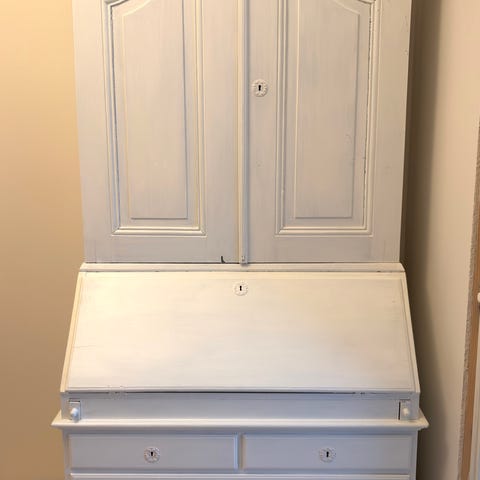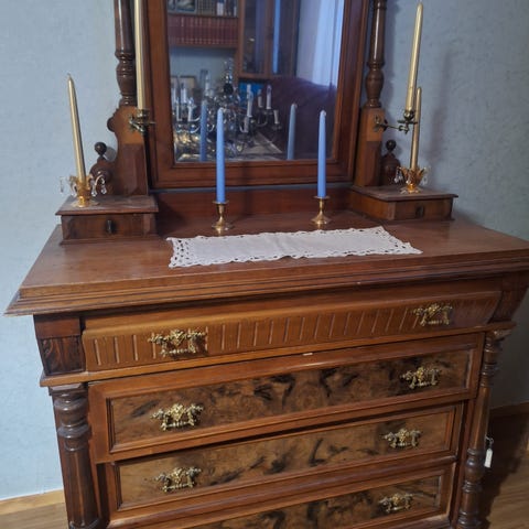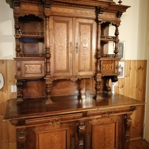 Antiikkinen eteiskaappi (hall stand) luultavimmin 1800-1900-luvun taitteesta. Kaluste on valmistettu massiivipuusta (luultavasti tammesta) ja siinä on tumma kiiltävä viimeistely. Kalusteissa on penkki, minkä alla säilytystilaa. Peili ja metallisia naulakoita, sateenvarjotelineet molemmin puolin kalustetta.