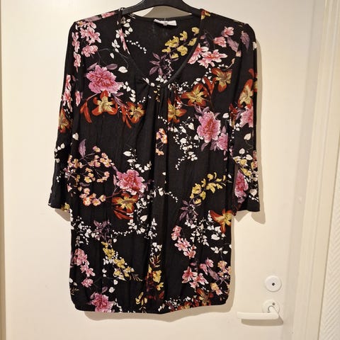 Zizzin kirjava viskoosipusero koko M. Kai-kai mitta 60 cm, pituus frillan kanssa 70 cm. Kiva kiristysnyöri vyötäröllä. Olen käyttänyt tätä kuvassa olevan viskoosi/akryyli neuletakin kanssa. Takin pituus 100 cm, muuten samaa kokoa kuin puserokin. Merkistä ei varmuutta, kokolappu leikattu pois.