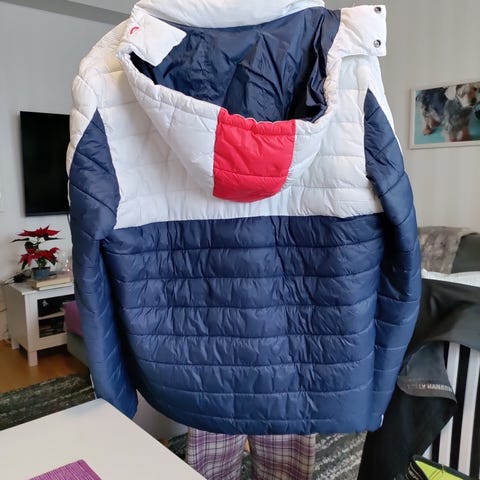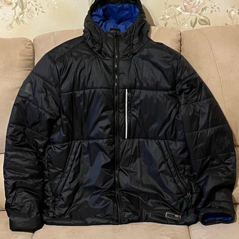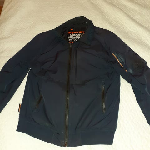 Hyväkuntoinen miesten Superdry kevyttoppatakki, sininen, koko XL. Irrotettava huppu. Siisti ja ehja, savuton ja lemmikkivapaa koti.