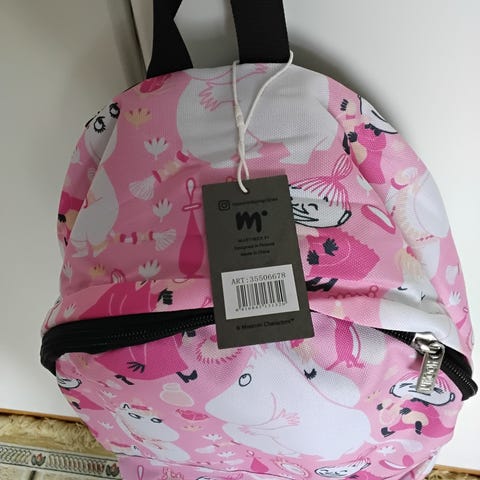 Moomin kangas reppu, jossa musta pohjaväri ja valkoisia Muumi-hahmoja sekä ruskeita ja vaaleanpunaisia kukkakuvioita. Reppu on unisex-mallinen ja valmistettu kestävästä kankaasta. Sopii arkikäyttöön ja kevyisiin kantotehtäviin.