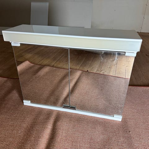 Valkoinen peilikaappi, jossa kaksi peiliovea ja sisätilaa hyllyillä. Sopii kylpyhuoneeseen tai muuhun tilaan, jossa tarvitaan peili ja säilytystilaa.