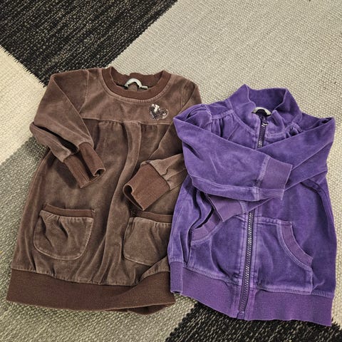 Villervallan värikäs tunika ja H&M:n mustat trikoohousut, molemmat kokoa 92. Käytetty päällä yhtä aikaa, mutta tunika on reilua kokoa ja meni meillä käytössä pidempään kuin housut. Tunikassa napit rinnassa, joten helppo pukea päälle. Housut ribbitrikoota ja pieni sydänkirjailu vyötäröllä.