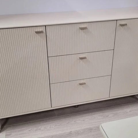 Kaksi ovea ja kolme laatikkoa. Ovien sisällä vielä hyllyt säilytykseen.