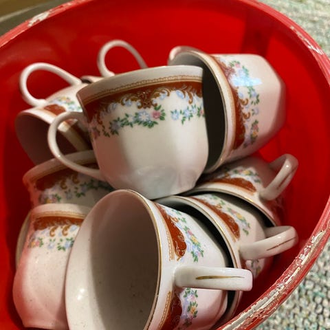 Kolme mustaa kuppia ja kaksi harmaata, kaikki ehjiä.