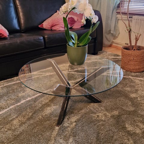 Mustaa puuta ja kirkas lasi. Upea, pelkistetty jalkaosa, joka valmistettu puusepäntyönä. ja paksu lasikansi.