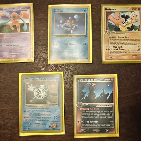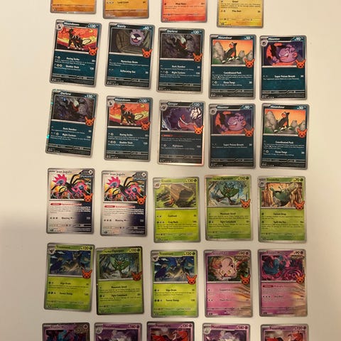 Yli 100 korttia, korttikansio (kunto on kohtalainen, merkintöjä sisällä), tinejä, noppia, magneetteja, sleevejä ja tarroja.
