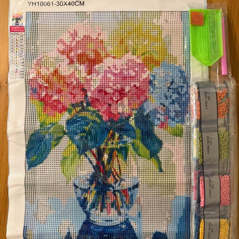 Suurikokoinen timanttityö avaamattomassa pakkauksessa. Koko valmiina 40x60 cm. Pakkauksessa mukana kuvio liimakerroksella, ohje, strassikiviä, tartuntakynä, lajittelualusta ja silokonivaha.