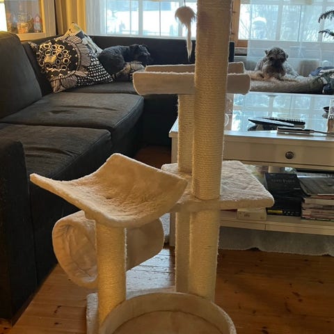 Seinään kiinnitettävä kiipeily/raapimapuu. Leveys 64cm korkeus 160cm. Puuta/laveria jossa karhea kangaspinta.