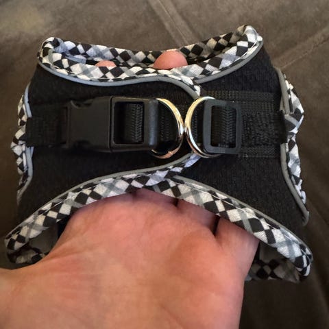 Pennulla lyhyen aikaa käytössä ollut musta valjas heijastinkorostuksilla, koossa S.