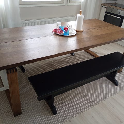 Ostettu vekeltä 2 vuotta sitte. Raskas, tukeva pöytä . Lakattu oston jälkeen. Pientä naarmua pöydässä (kuva) . Ostaessa maksoi 959€. Hinnasta voidaan neuvotella.