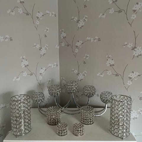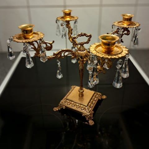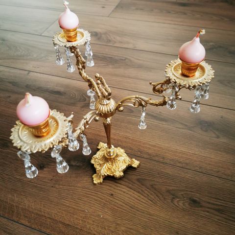 Turun kristallin kullattu 3 haarainen kaunis kynttelikkö, jossa 14 koristekristallia. Tästä puuttuu isompi kristalli keskeltä. Muuten hinta olisi 125 eur. Leveys ja korkeus noin 30 cm. Syvyys noin 10 cm. Paino tarkalleen on 1,565 kg.
