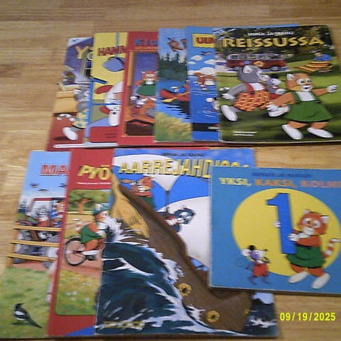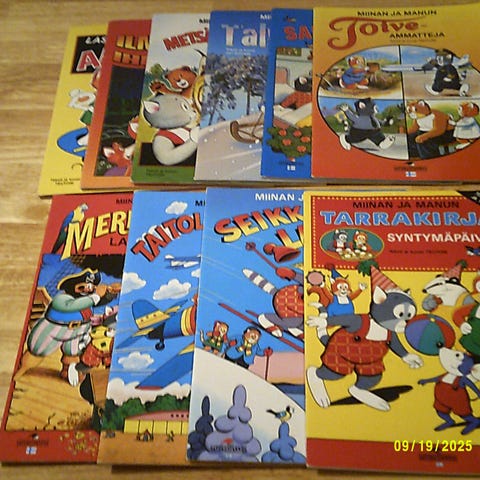 Hyväkuntoiset Miina ja Manu -kirjat + cd:t, cdt on meillä toimineet hyvin, eivät kyllä hetkeen enää olleet käytössä, eikä nyt ole soitintakaan enää, jolla varmistaa.