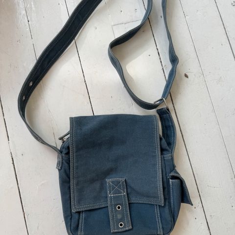 Mustavalkokuvioinen kankainen olkalaukku Ehta-merkiltä. Valmistettu Suomessa. Sisällä kolme taskua, joista yksi vetoketjullinen. Edessä ja takana kaksi taskua.