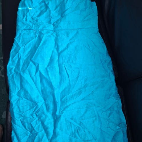S.T.I sininen pellavamekko koko 36. Hihaton mekko, olkapäillä koristerypytykset, pieni halkio kaula-aukossa, edessä muotolaskokset, takana vetoketju alaselkään, irrotettava vyö, takana helmassa halkio, liukas vuori. Eläväpintainen kangas, 90 % pellavaa, 10 % polyamidia. Mekko hyväkuntoinen, vähän käytetty.