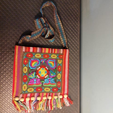 Pyöreänmuotoinen olkalaukku, materiaali jotain kumi-/muovisekoitetta. Hihna ja laukun takaosa ovat mustia, etuosa harmaata kukonaskelkuviota. Laukun halkaisija n. 18 cm. Jäänyt käyttämättä joten uudenveroisessa kunnossa.