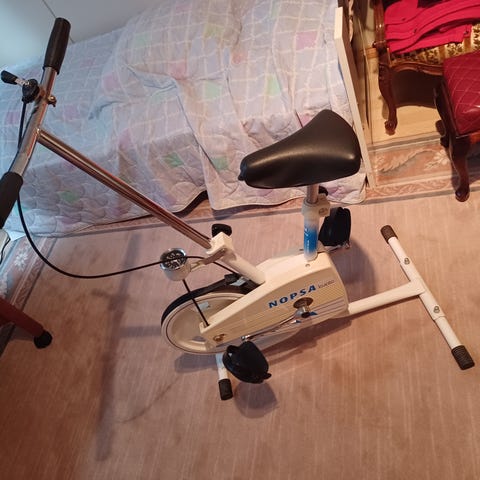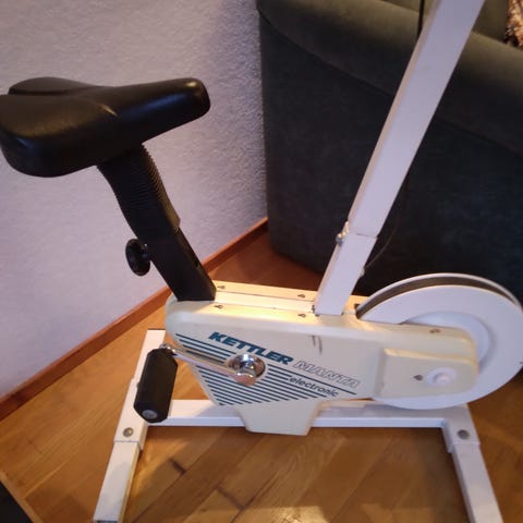 Kuntopyörä, jossa musta runko ja hopean väriset yksityiskohdat. Varustettu digitaalisen näytön kanssa, joka näyttää harjoituksen tiedot. Polkimissa on remmit. Satula ja ohjaustanko ovat säädettävissä käyttäjän mukavuuden mukaan.