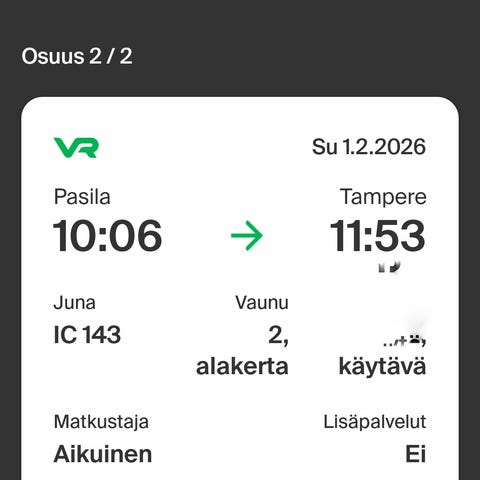 20.1.2026 - Tampere - Helsinki - Tampere junaliput / junalippu