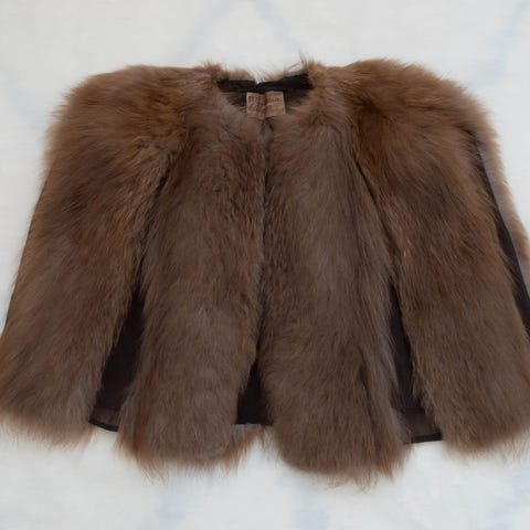Upea harvinainen 1950–1960-luvun harmahtava turkissbolero, jossa on kaunis kirjailtu vuori ja puhvihihat. Edessä on kaksi hakasta kiinnitystä varten.