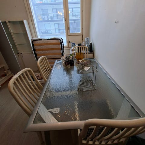 Ehjä pöytä ja 2 tuolia. Toisen tuolin istuinosassa punokset hieman irronneet. Ei kännissä istuskellessa haittaa lainkaan. Nouto Espoon Saunalahdesta.