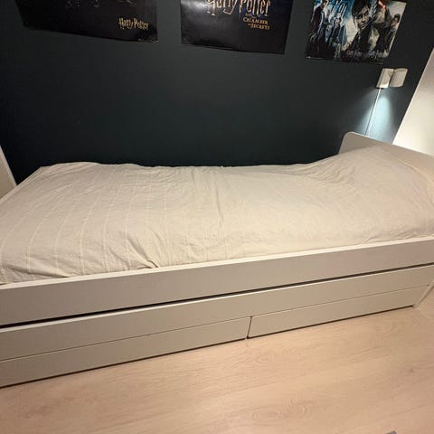 Ikean oikein hyväkuntoinen valkoinen Släkt-sänky 90x200 cm vedettävällä varavuoteella ja kahdella säilytyslaatikolla. Patjat saa halutessaan mukaansa. Nouto Ylöjärveltä.