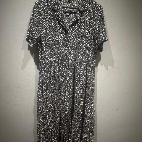 Monkin viskoosimekko koko 36 (kainalo-kainalo-kainalo n. 45 cm). Kangas joustaa jonkun verran. Väri vaaleansininen jossa mustia pisteitä. Vyötäröllä solmittava kangasvyö. Erinomaisessa kunnossa, ei vikoja tai kulumia.