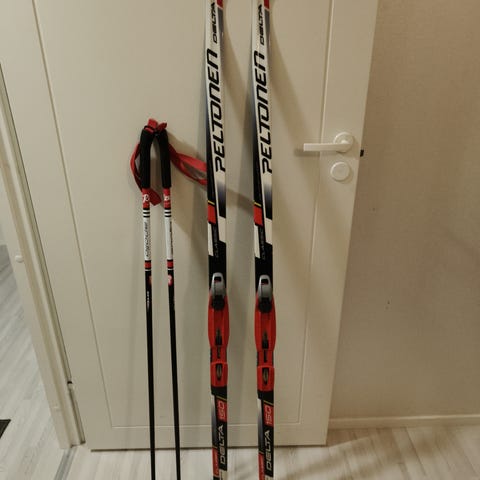 Käytetyt sukset, 185 cm pitkät, sauvat on 130 cm . Salomon siteellä. Mmm.
