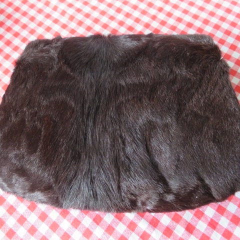 Ruskea vintage turkiskäsilämmitin/ muhvi. Toisella puolella on vetoketjullinen tasku ja lenkki/kahva, jolla muhvin voi ripustaa ranteeseen. Sekä tasku että sisäpuoli (käsille tarkoitettu tila) on vuorattu.