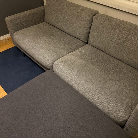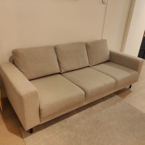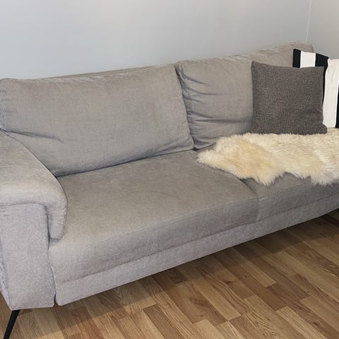 Noin seitsemän vuotta vanha sohva, merkki Finsoffat. Väri vaaleanharmaa. Runko erinomaisessa kunnossa. Istuin- ja selkätyynyjen päälliset irrotettavat ja pestävät. Päälliset on istuinosien kankaan osalta kuluneet. Käsinojat tummuneet ja sohvassa joitakin tahroja.