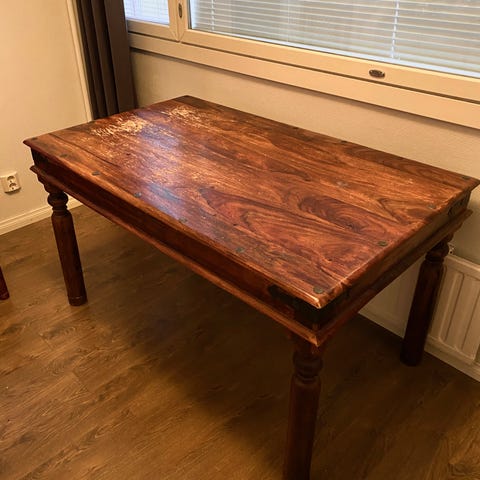 Tukeva täyspuinen ruokapöytä, mutta en nyt muista puulajia. Molemmilla puolilla kätevää säilytystilaa tarjoavat vetolaatikot.