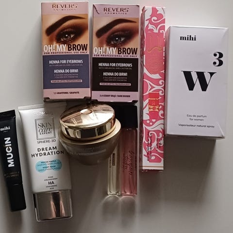 Rusketusöljy suojakertoimella, suihkugeeli, kaksoisvaikutus geeli vartalolle (jäähdytys + lämmittely), hammastahna, meikinpuhdistusliinat, luomiväri, volume ripsiväri (pohjustusaine + ripsiväri)