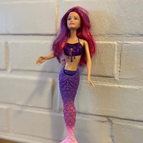 Barbie nukke, jolla on violetti, musta mekko, violetit saappaat ja lila kitara, jossa on kukkakoristeita. Nukke on tarkoitettu leikkeihin ja keräilyyn.